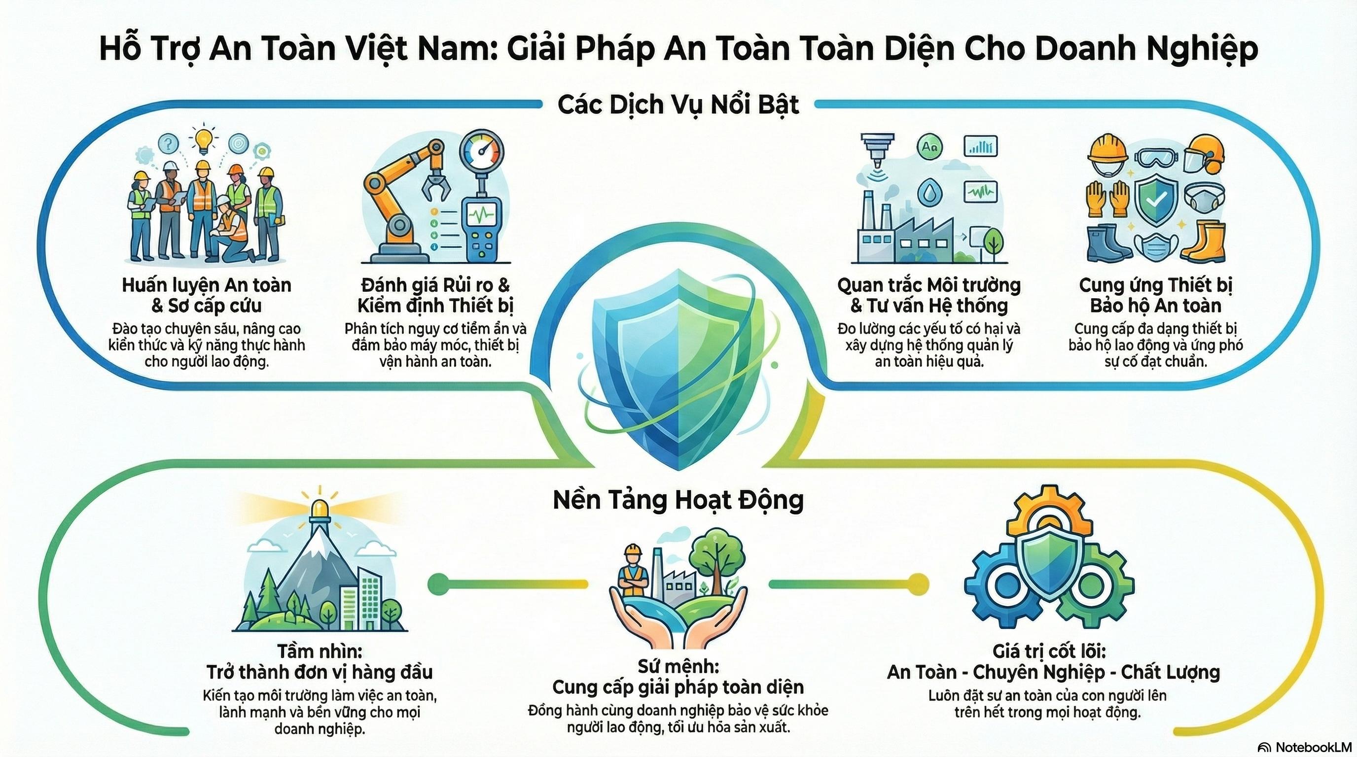 Hơn thế nữa, phạm vi của một hệ thống an toàn không chỉ dừng lại ở huấn luyện. Việc xây dựng một môi trường làm việc an toàn toàn diện phản ánh một cách tiếp cận "chuyên nghiệp và trách nhiệm", bao gồm một hệ sinh thái dịch vụ đa dạng. Bản đồ này thực sự mở rộng khi bao gồm: huấn luyện sơ cấp cứu, quan trắc môi trường lao động, đánh giá rủi ro, kiểm định an toàn thiết bị, tư vấn xây dựng hệ thống quản lý ATVSLĐ, và cả cung ứng thiết bị an toàn chuyên dụng.